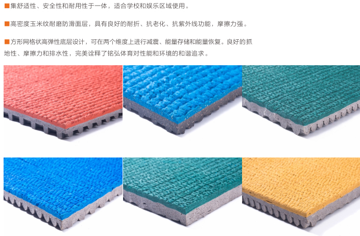 l多色彩效果: 不眩目多色彩組合,增添了運動場的美觀,帶給運動參與者愉悅的身心體驗。