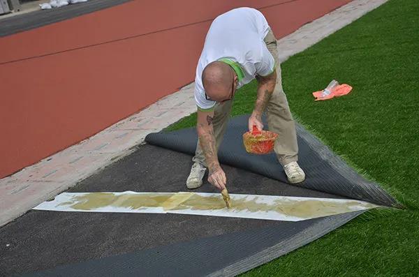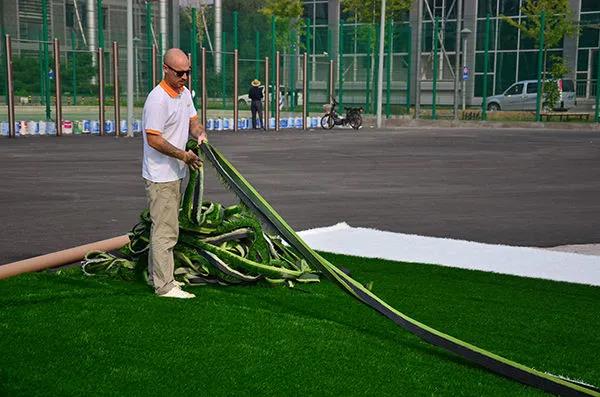 接下來就是把人工草坪用粘貼帶逐個的進行粘貼,使用專門的馬貝膠水對草皮進行鋪設,然后還有進行平整的擠壓,使其盡快的粘貼,中間不留痕跡,同時還有就是不同板塊的草坪之間進行銜接,標準的要求是不能超過3mm。縫隙太大,在使用的過程中可能會產生很多的事故并且嚴重的情況下會危害運動員的職業生涯。