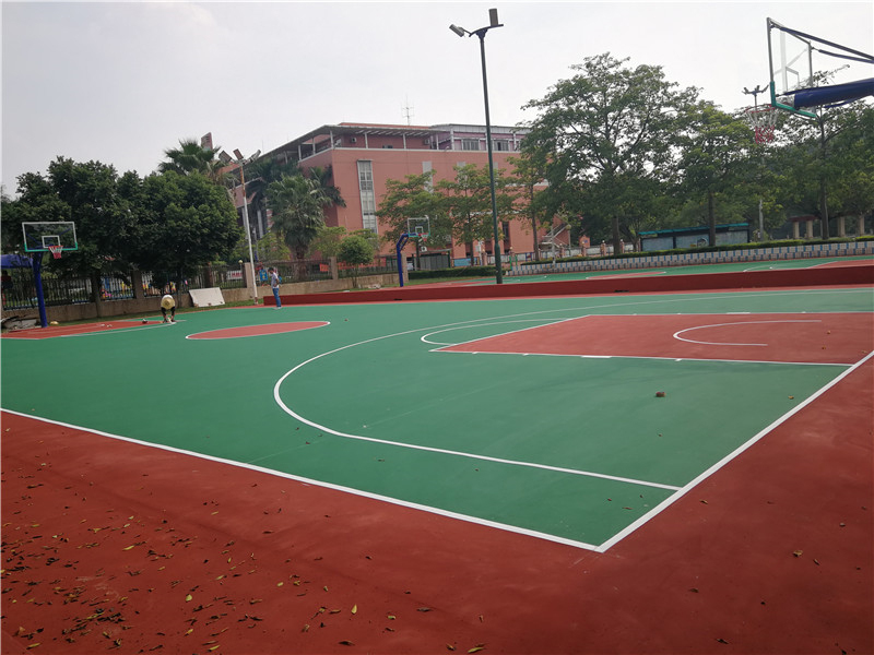 這是一種現場澆鋪用刮板制作在瀝青混凝土上或鋼盤混凝土結構地面上的新型材,其工藝主要分為找平結合層、加強層、耐磨層等多層做法,還有含膠粒的多層做法這種面層材料及工藝的優點是平整度高、表面硬度高、耐磨、抗曬、色澤鮮艷、使用壽命長便于管理和維修。這種面層材質穩定的籃球場,球員場上跑動舒服,是一種既可供娛樂打球也可用做正規比賽的高檔次籃球場地。